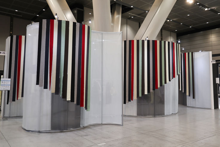東レ様のテキスタイルを数種類使用してブース全体を構成し、空間を軽やかに表現しました。